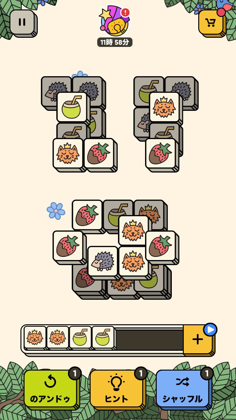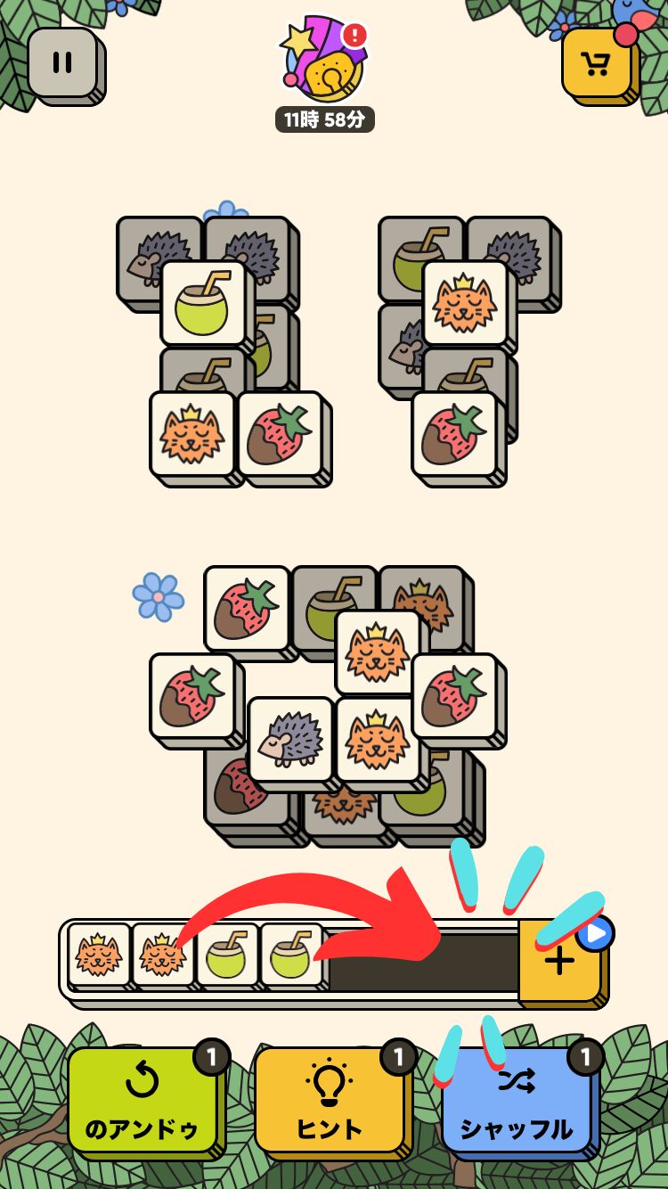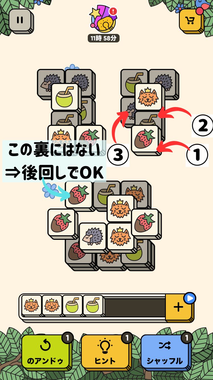 例えば、下の画像の③のハリネズミを選択するには、①いちご → ②ココナッツとオオカミ を取り除いておく必要があります。