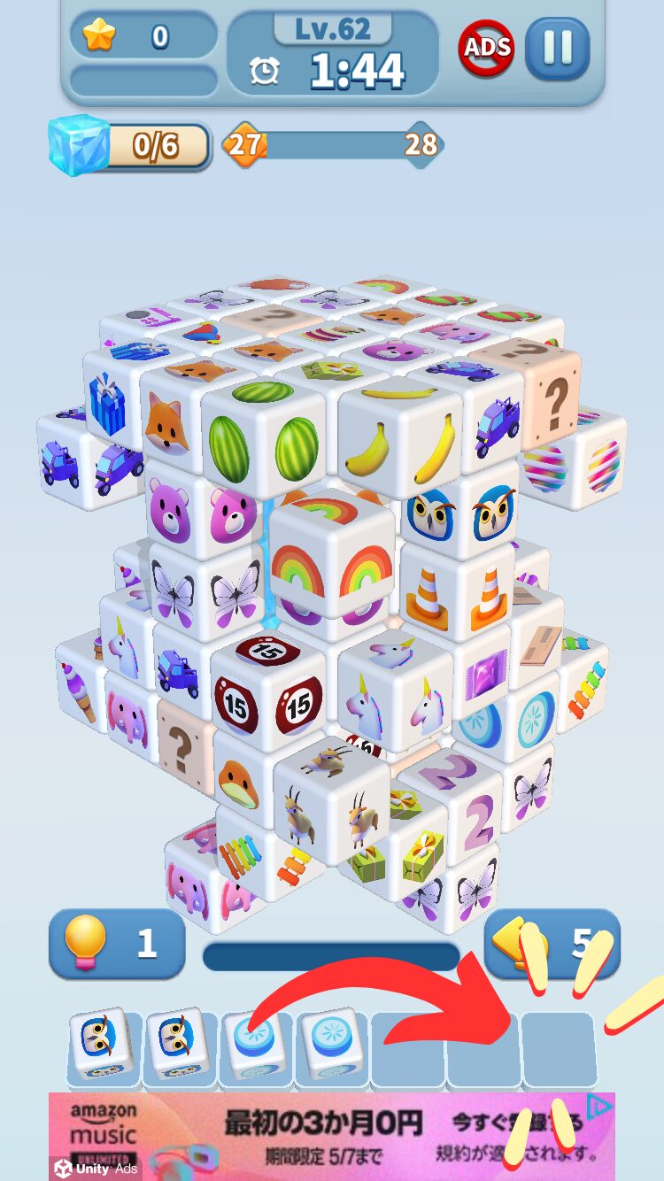 また、パズルゲームではたまに広告視聴によりステージスキップできるアプリもありますが、このゲームは広告によるステージスキップはありませんでした。