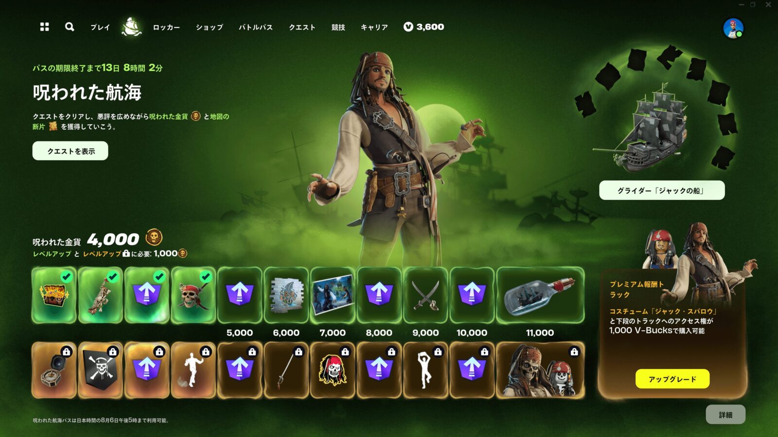 同時に配信された「呪われた航海」クエストでは、ジャック・スパロウのスキンや土入り瓶のエモートなど、存分にパイレーツ感を楽しめる報酬が用意されていました。